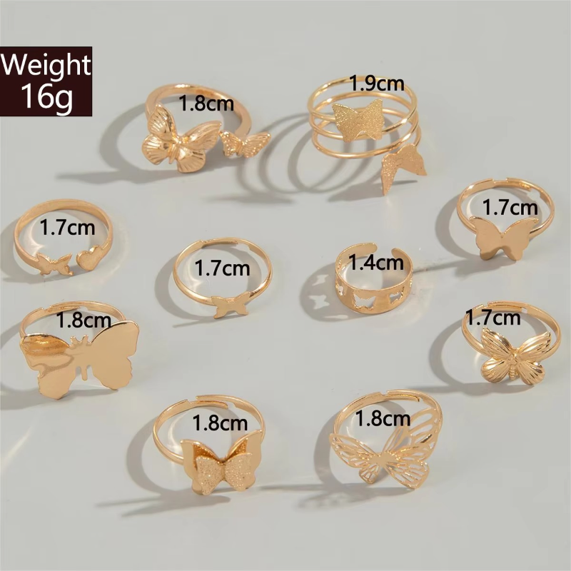10 Pcs Elegant Gold Metal Butterfly Adjustable Ring Set