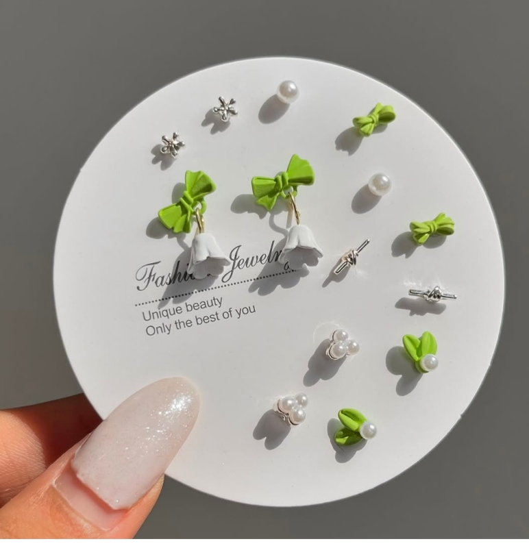 7 Pair Green Bow Pearl Stud Earrings Set (1 Pata)