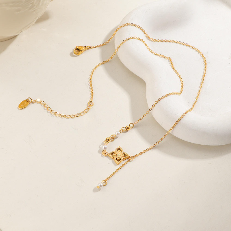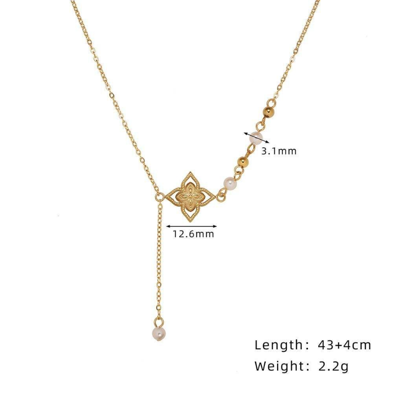 Four Leaf Clover Pearls V-Shape Necklace