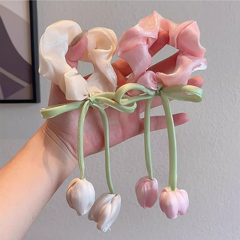 Tulip Flowers Scrunchie Ribbons Hair Rubber ( 1 Pc)